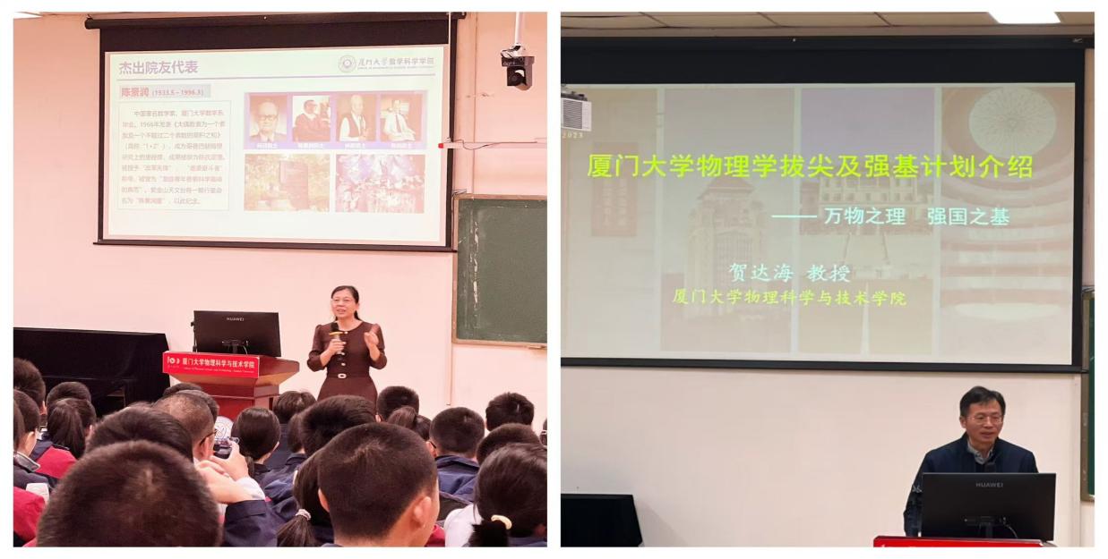 在学校招生与考试办公室和我院的精心组织下,我院联合数学科学学院在物理大楼117报告厅为双十师生带来了丰富多彩的招生宣讲与科普讲座。首先,数学科学学院数学与应用数学系副主任杜妮副教授介绍了数学强基计划的人才培养与政策,我院贺达海教授也介绍了物理学强基拔尖计划的培养特色,让同学们领略了厦门大学“数理”的独特魅力。