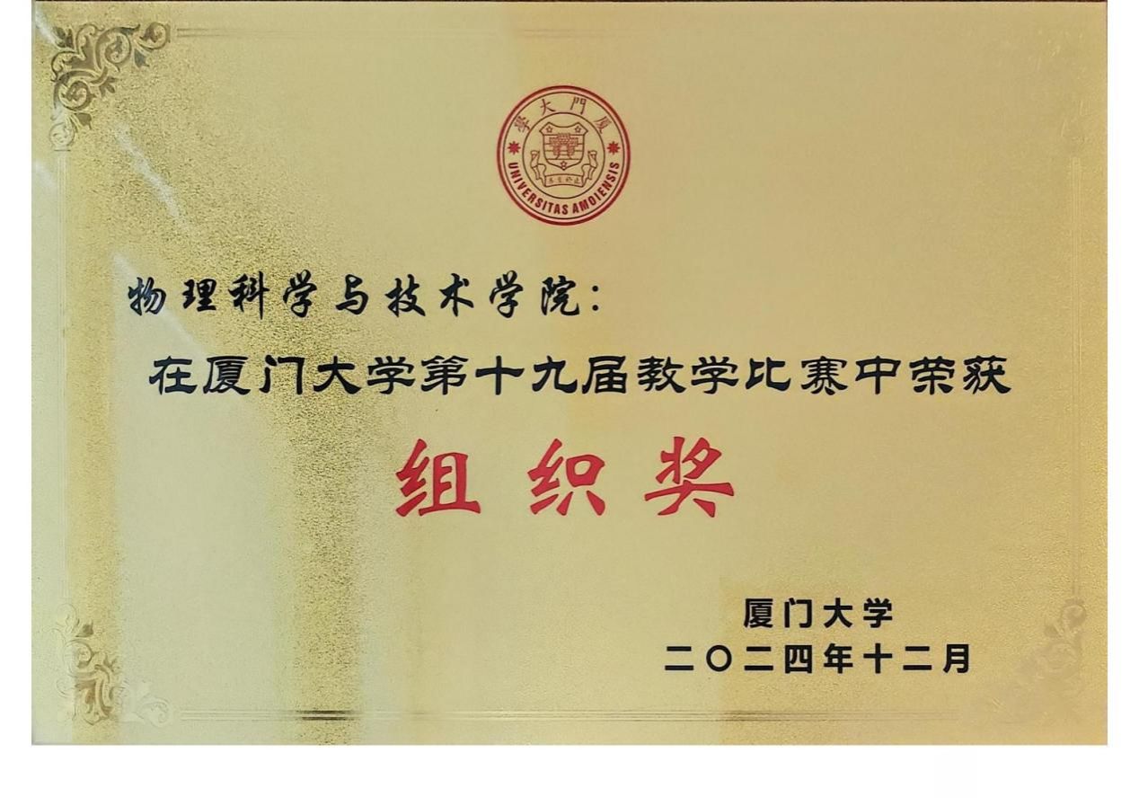在厦门大学第十九届教学比赛中,我院教师共获得一等奖4项、二等奖4项、最佳教学设计奖1项,以及教学比赛组织奖。其中,在青年教师教学技能比赛中,曹学正老师获一等奖,杜敏老师获二等奖;在实验教学比赛中,吴雅苹老师团队(高娜、李煦、张纯淼、曹艺严)获一等奖;在教学创新比赛中,林友辉老师团队(陈理想、吕铁羽、林昶旭)获一等奖,薛力老师,苏山河老师团队(苏国珍、李书平)获二等奖;在英语教学比赛中,孙阳老师获一等奖,黄巧玲老师获二等奖及最佳教学设计奖。此外,姚真瑜老师获得2024年全国高等学校物理基础课程青年教师实验教学讲课比赛全国一等奖;张武虹老师团队(吴顺情、苏国珍、陈理想)获得第四届福建省高校教师教学创新大赛二等奖。在此对取得优异成绩的各位老师表示热烈祝贺。