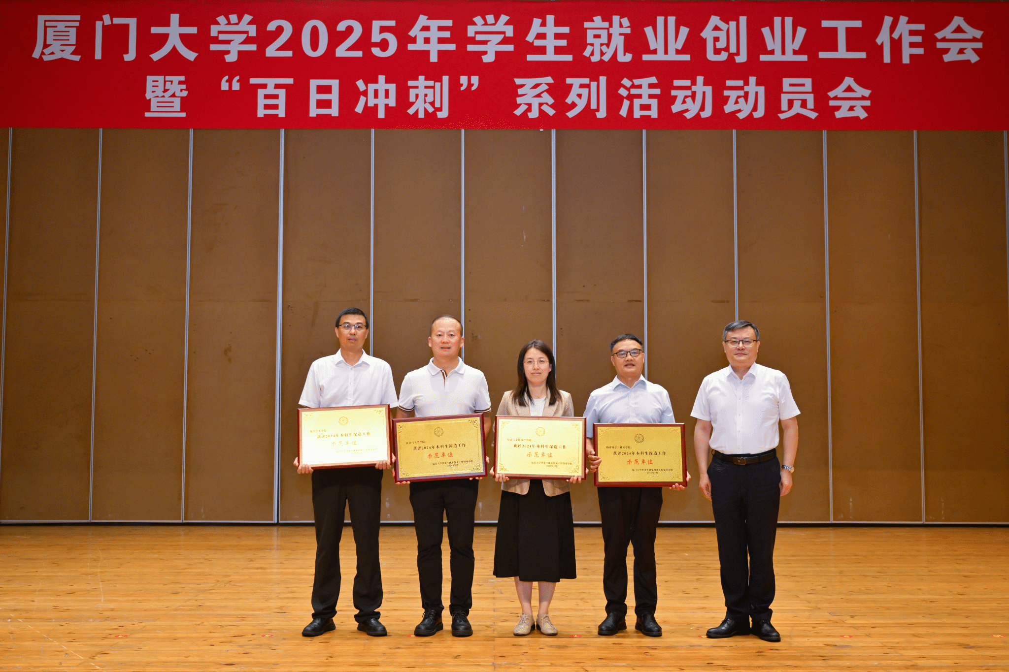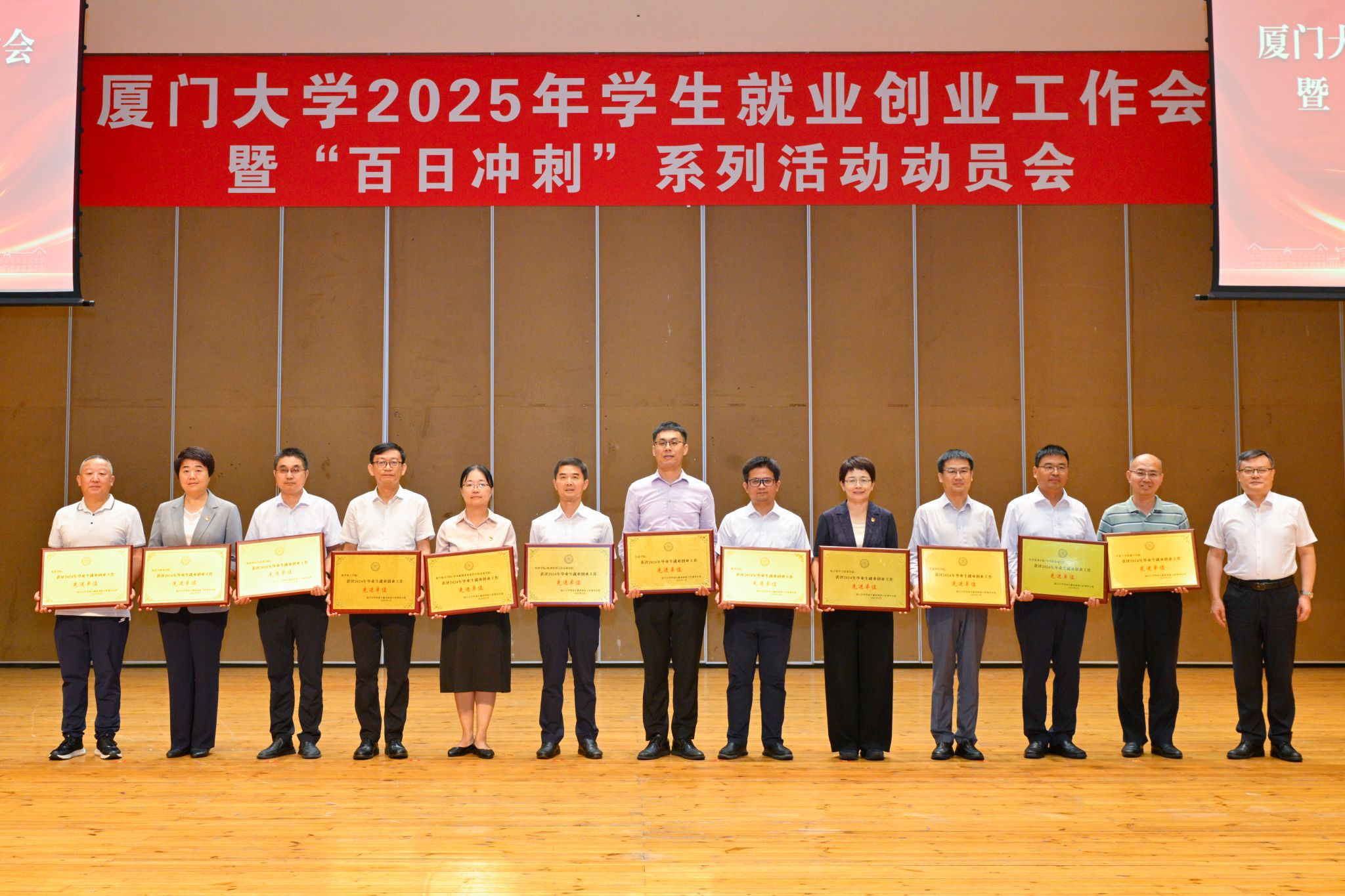 5月19日,2025年厦门大学学生就业创业工作会暨“百日冲刺”系列活动动员会在科学艺术中心音乐厅举行,会上对2024年毕业生就业创业工作先进单位、本科生深造工作示范单位和先进个人等进行表彰。我院共获得6项荣誉,分别是:毕业生就业创业工作先进单位三等奖、本科生深造工作示范单位、“就业引航名师”优秀组织奖,物理学系副教授林昶旭入围第一批厦门大学“就业引航名师”、2024届研究生毕业班带生辅导员邱丹文获得就业成果先进个人奖、本科毕业班带生辅导员范荣获得本科深造先进个人奖。物理科学与技术学院党委书记李书平、党委副书记郑诚明代表学院分别上台领奖。荣誉的取得充分展现了学院在就业服务和人才培养等方面的扎实成果。