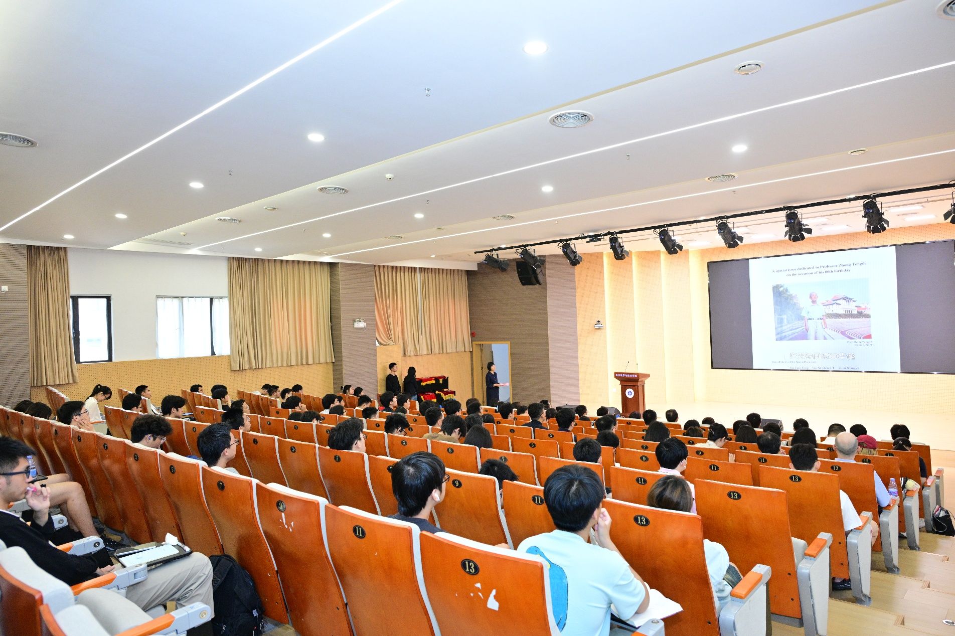 为表达对数学系原系副主任、厦门大学“南强杰出贡献奖”获得者钟同德老师的敬仰之情,“刘晓数理电子科学奖”面向数学科学学院师生的部分,命名为“同德奖教奖学金”。2025年3月,钟同德老先生因病辞世,享年98岁。颁奖仪式中,现场师生们观看钟同德先生的纪念视频,了解他潜心科研、深耕教育的感人故事。钟同德教授德高望重,淡泊名利,他身上所体现出的“板凳甘坐十年冷、毕生事业一教鞭”的人生追求,生动诠释了报效祖国、勇攀高峰的科学精神,也激励着所有师生进一步弘扬自强不息、止于至善的校训精神,不断求索,不负所托。