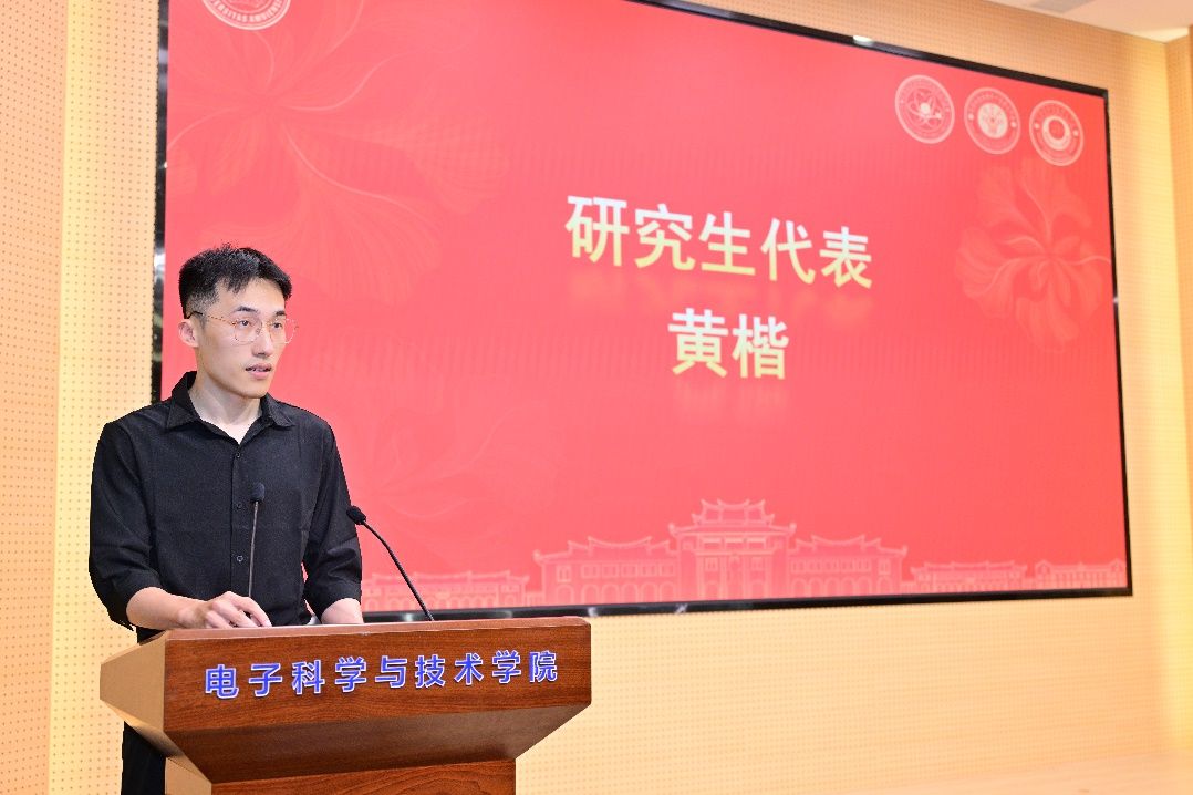 研究生获奖代表、电子科学与技术学院博士生黄楷对刘晓校友捐资设立奖学金与导师提供的指导帮助表示了感谢。他分享了读博期间,在5G毫米波滤波天线、多频段共口径基站天线阵列设计等方面取得的优异成果,并积极参与各类科创竞赛,将实验室的构想转化为可落地的方案,坚定了“以技术解决真问题”的信念。在今后的科研工作中,他将继续深耕细作、笃行致远,在科学研究的道路上攀登更多高峰。