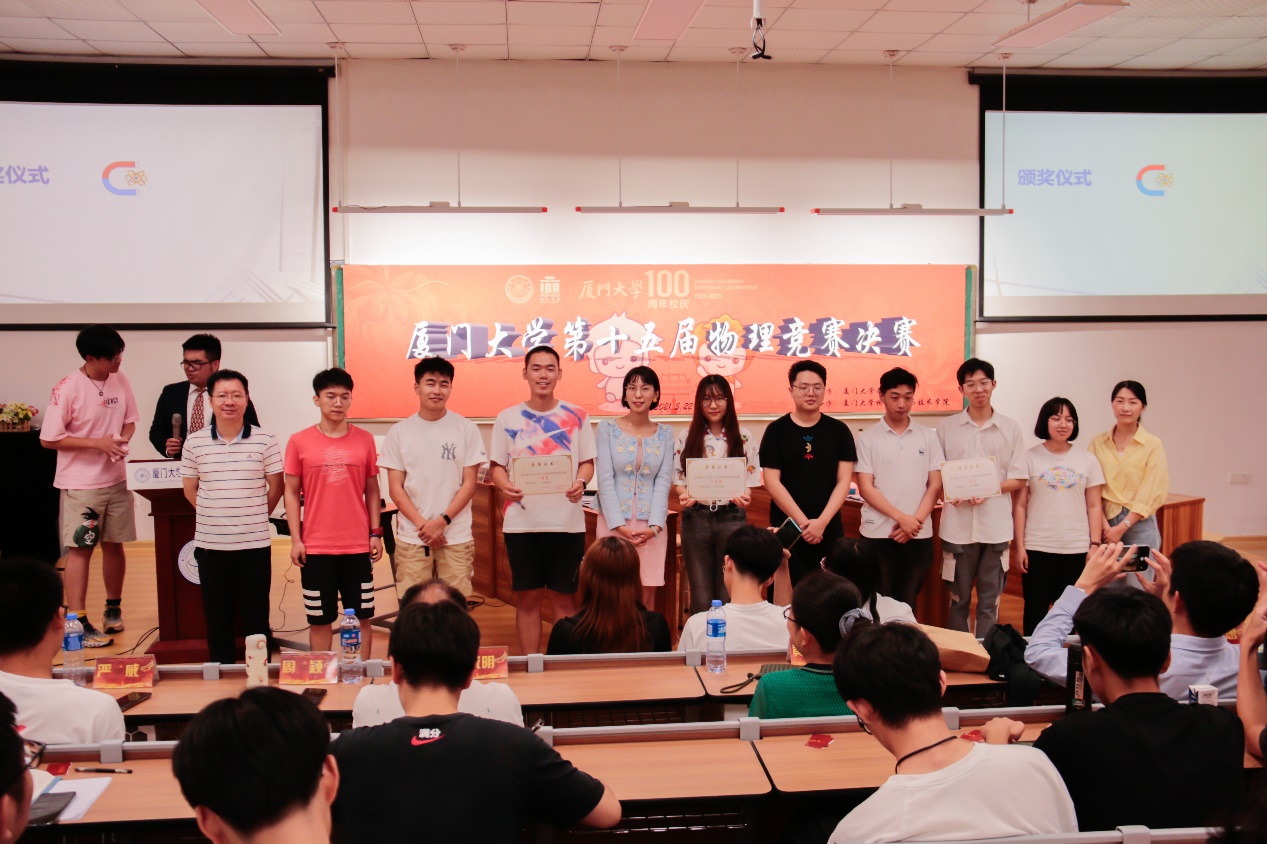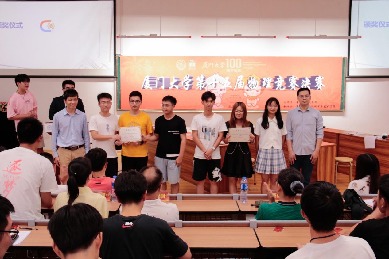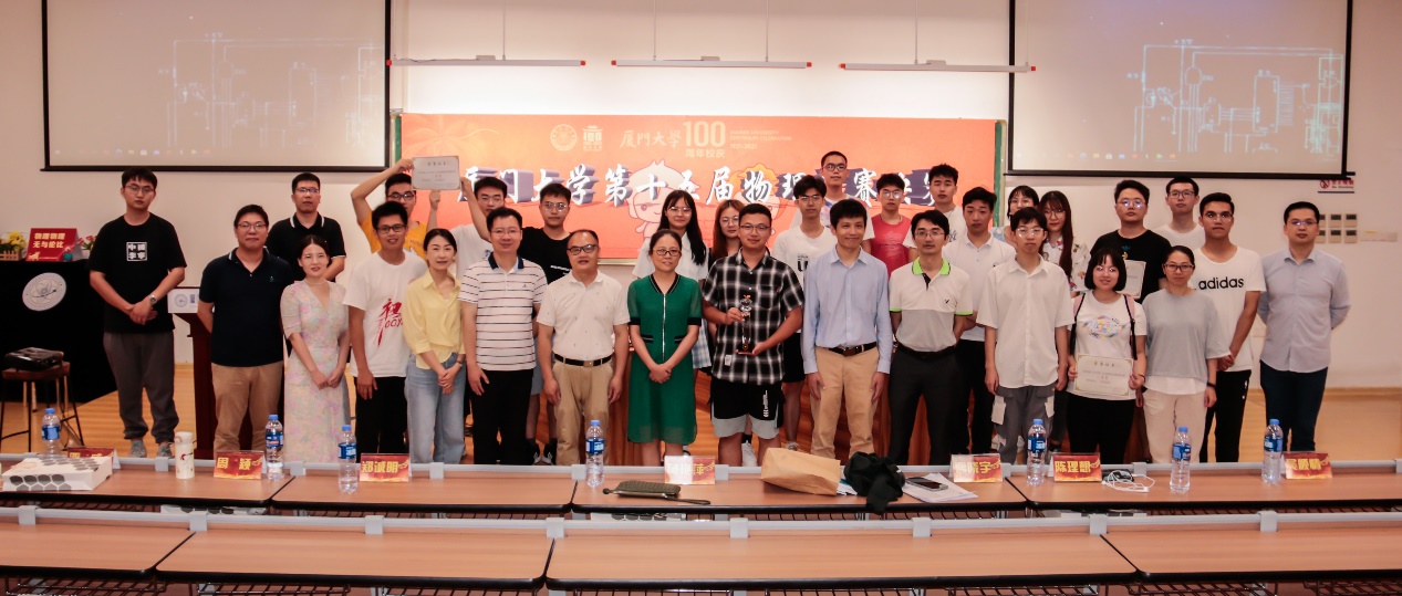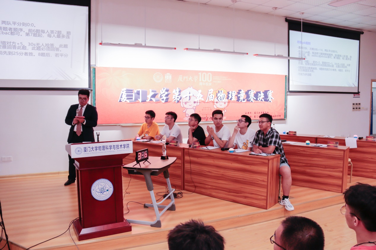 出席本次物理竞赛总决赛的嘉宾有:厦门大学教务处黄艳萍副处长、物理科学与技术学院副院长陈理想教授、物理科学与技术学院党委副书记郑诚明老师、物理学系系主任吴顺情主任、化学化工学院院长助理、教学与实践中心常务副主任曹晓宇教授、管理学院的团委副书记周颖老师、电子科学与技术学院的辅导员严威老师、物理科学与技术学院辅导员陈洪老师、辅导员胡艳婷老师;以及林昶旭、张志森、黄巧玲等竞赛组老师;本次比赛由吕铁羽老师担任裁判。