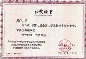 2021年7月18-21日,由高等学校国家级实验教学示范中心联席会、全国高等学校实验物理教学研究会、中国物理学会物理教学委员会主办,南开大学、天津大学和天津市物理学会承办的第七届全国大学生物理实验竞赛(教学赛)在天津成功举办。本届竞赛共有来自北京大学、复旦大学等全国112所高校、400余名学生参加。我院2019级王纪雨、张章勇、徐艺轩和黄楠同学代表我校参加了本次比赛,经过激烈角逐,取得了综合类实验一等奖(1项),基础类实验二等奖(2项)的好成绩。同时,我校也荣获本次竞赛的优秀组织奖。