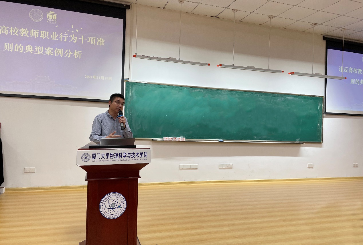 首先,陈理想副院长开展“院长谈准则”专题讲座,全面解读《新时代高校教师职业行为十项准则》《研究生导师指导行为准则》《教育部关于高校教师师德失范行为处理的指导意见》《厦门大学关于加强教师思想政治和师德师风建设工作的实施意见》等文件,号召全体教职工把握教师职业准则,学习践行新时代师德规范,做“有理想信念、有道德情操、有扎实学识、有仁爱之心”的“四有”好老师。