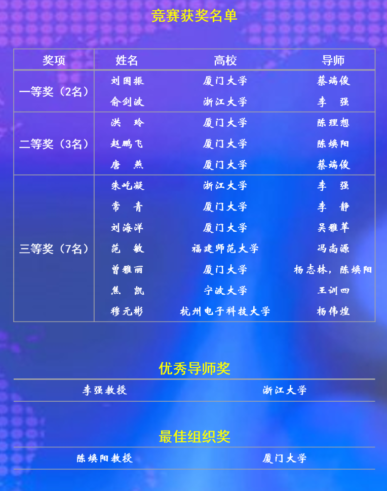 选手根据前期的抽签顺序逐一进行8分钟的PPT汇报,并在报告后进行2分钟的专家问答。评分来自评委和参赛学生两组,主要从创新性、完整性、应用前景和表现力四个方面进行评价。经过激烈的角逐,最终产生了一等奖2名,二等奖3名,三等奖7名。同时,组委会根据大赛报名情况和入围国赛的选手情况,评选出优秀导师奖1名,最佳组织奖1名。其中的前10名获奖选手,还将组成海峡联队进入全国总决赛的进行角逐。