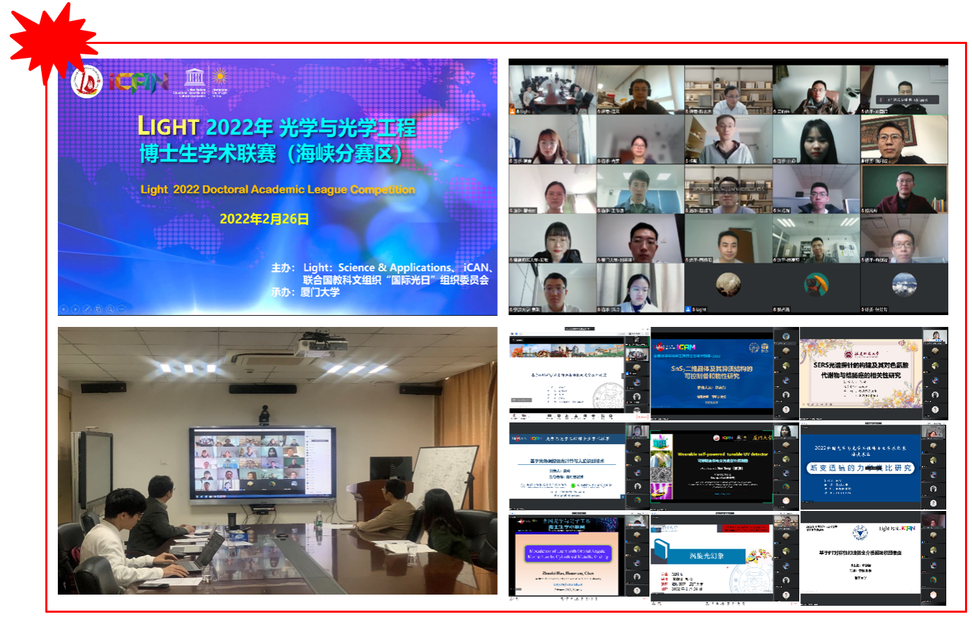2022年2月26日,全国光学与光学工程博士生学术联赛(海峡赛区)在厦门大学成功举办并圆满落下帷幕。该联赛由国际前沿Light杂志社、iCAN、联合国教科文组织“国际光日”组织委员会所主办,厦门大学承办,物理科学与技术学院资助。