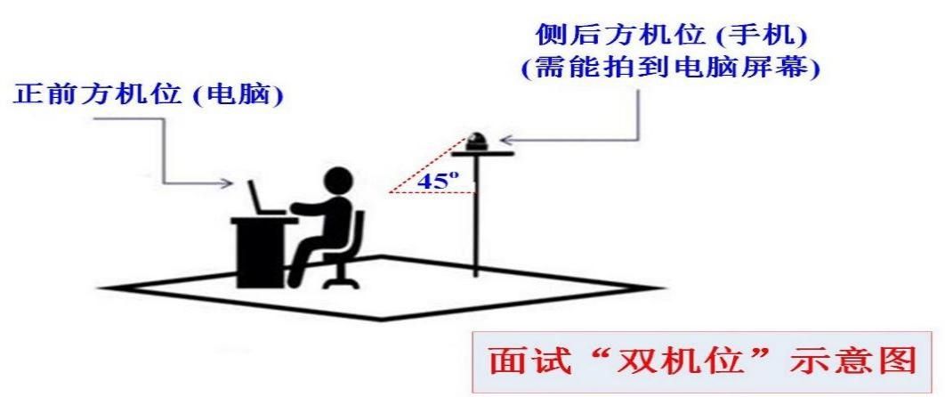 (2)面试采用“双机位”,一个为正面答题机位(电脑,使用“随会”App),一个为侧后方监控机位(手机,使用“随会”App),如下图所示: