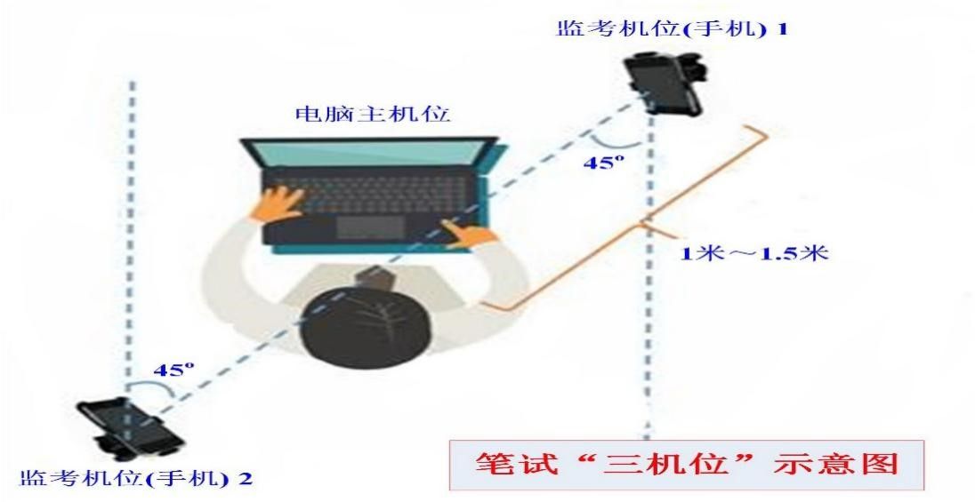 (1)笔试采用“三机位”,一个为正面答题机位(电脑,使用“腾讯会议”App),两个为监控机位(手机,侧前方和侧后方,使用“随会”App),如下图所示: