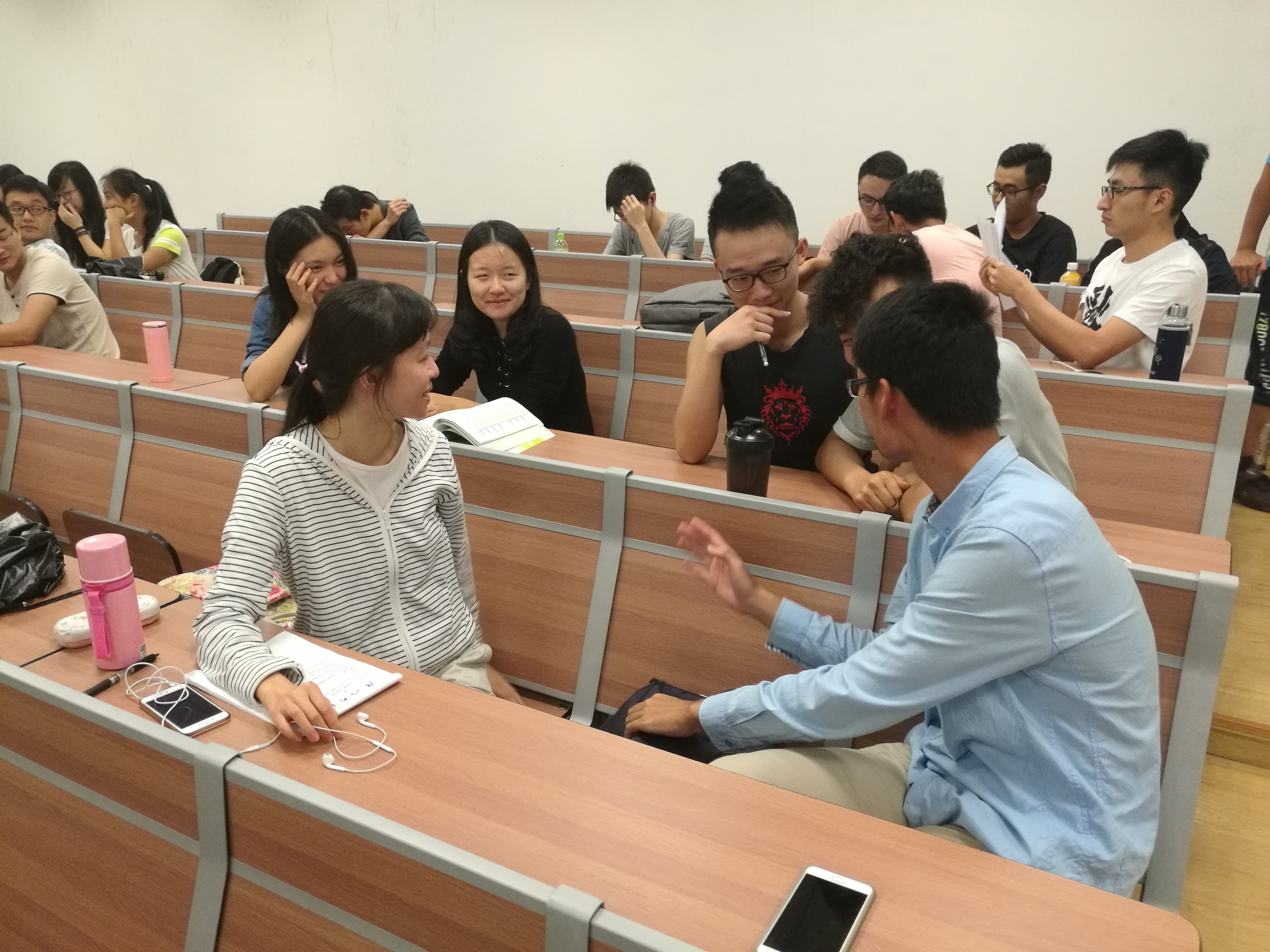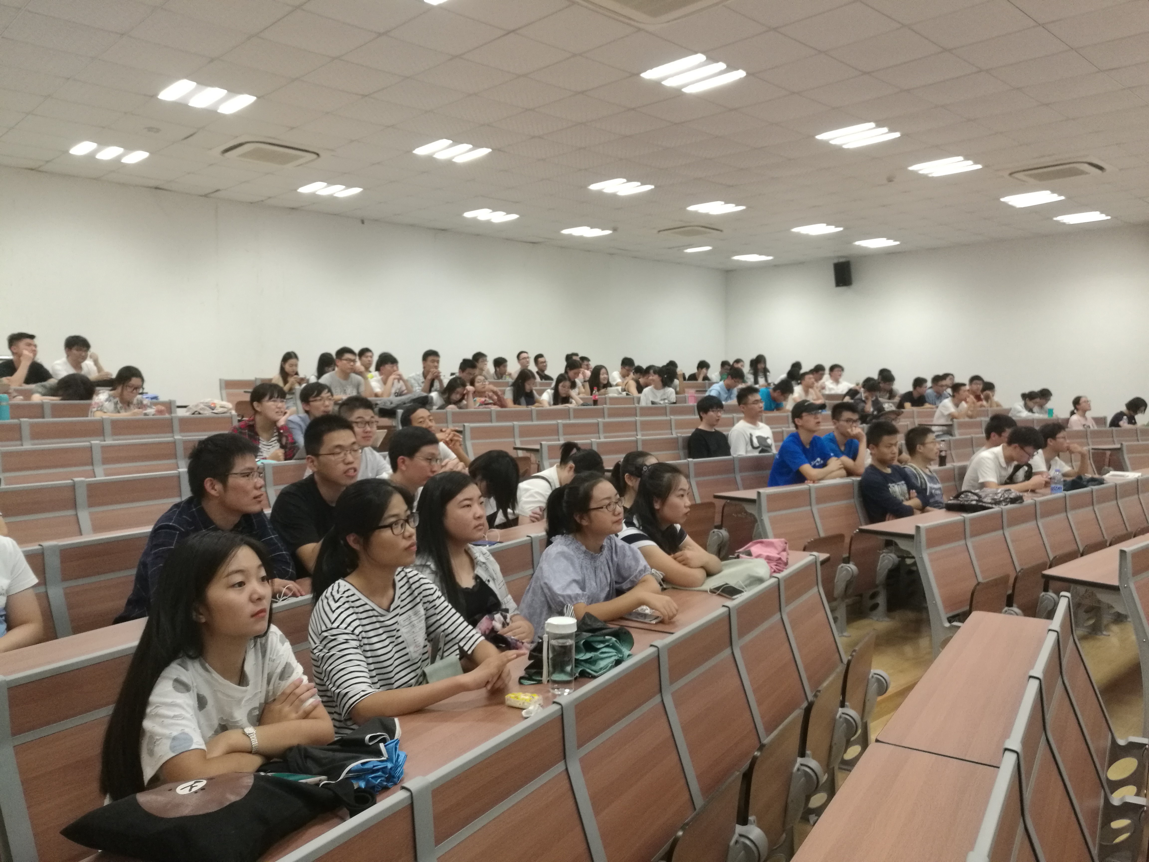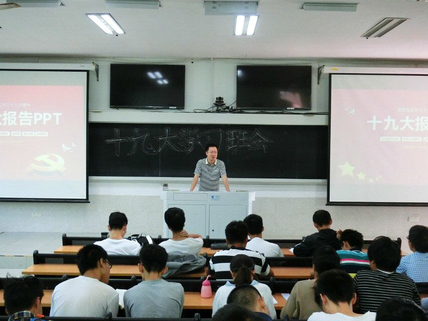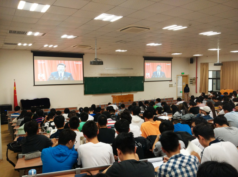 2015和2016级同学,首先一起学习了习近平主席在党的十九大开幕会上的所作的报告。通过学习,大家对当前形势下中国发展的重点有了更清晰的认识,进一步理解了习近平新时代中国特色社会主义思想的精神实质和内涵和坚持推动构建人类命运共同体的要求。然后,同学们按照学习小组坐在一起,大家时而激烈争辩,时而慷慨陈词,在讨论中进一步深入理解了“中国梦”,习近平新时代中国特色社会主义思想等重要词语和习近平总书记报告的重要内容。接着,郑对泉、万智、王亚军、朱星宏、徐国豪、何雨婷等同学分享了自己的学习心得。15级物理系的郑对泉同学率先走上讲台,他用超级计算机、C919国产大型客机等生活中的具体事例,说明了科技创新在一个国家发展过程中的重要作用,鼓励同学们牢牢掌握专业知识的同时,还要开拓视野,成为新时代的创新型人才。最后,辅导员邱丹文老师结合自身生活,分别举了科技,经济,法制等不同领域的例子,说明了在以习近平同志为核心的党中央的坚强领导下,我们国家蒸蒸日上,发展日新月异、人民生活水平不断提高。同时鼓励同学们应当以国家和社会发展为己任,不断努力,提升自己,投身科学,做出贡献。同学们的热情高涨,纷纷表示了自己要脚踏实地,努力学习,为实现中国梦作出自己的一份贡献的决心。