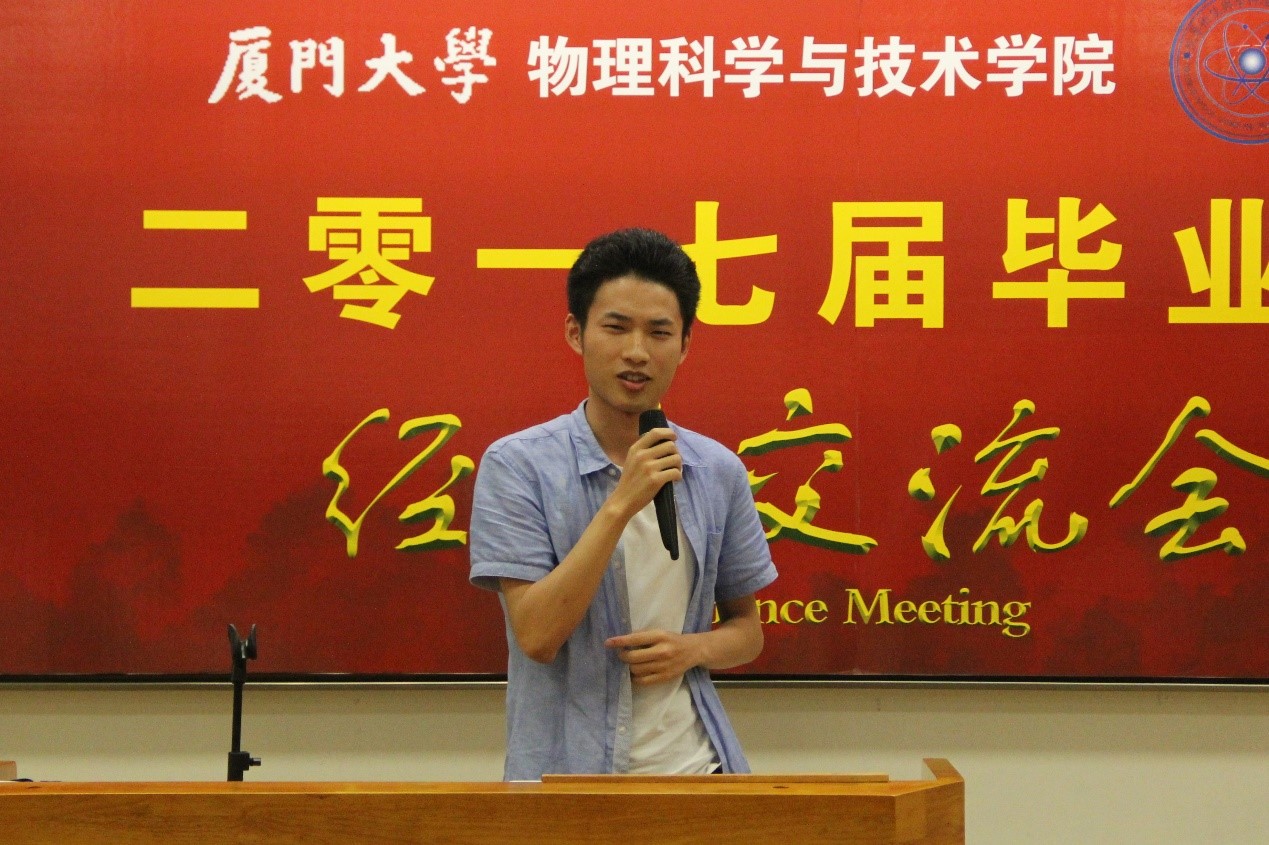 2017年5月10日,我院2017届毕业生经验交流会在物理大楼117会议室隆重举行。出席本次大会的嘉宾有物理科学与技术学院党委副书记郑诚明老师、团委书记邱荣锋老师、团委副书记陈洪老师。本次大会邀请了章杨、杨奇志、沈培鑫、任靖宇、蓝天、江迎、黄家铭、胡靖敏、郝月、方一奇、闫志朔等十一位2017届优秀毕业生,与低年级同学分享出国、考研、保研、就业、支教等经验。