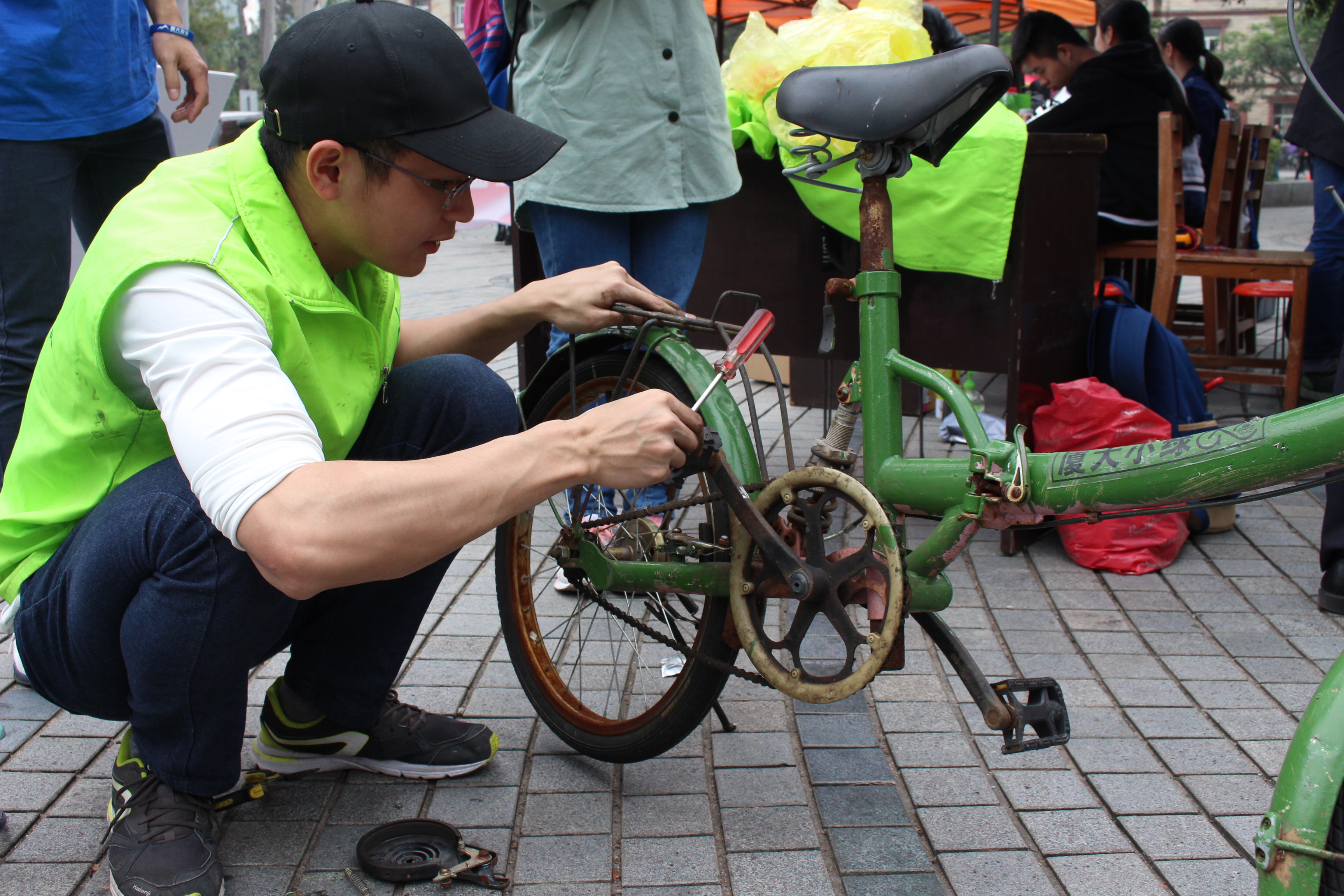 志愿者们从早上八点,一直工作到下午四点,不辞辛劳。早早地,就能看见一抹新绿跳动在校园中—— “小绿”志愿者们从新的“小绿”基地载来各种零件,正和电维社、益家人志愿者一起布置场地。无论是有问题的自行车,还是稍有问题的小电器,志愿者们都接下认真修理。气温微凉,下起小雨,志愿者们抹一抹脸上的雨水,披上雨衣在雨中继续尽责工作。所谓“益心益意,重修旧好”,便是如此。