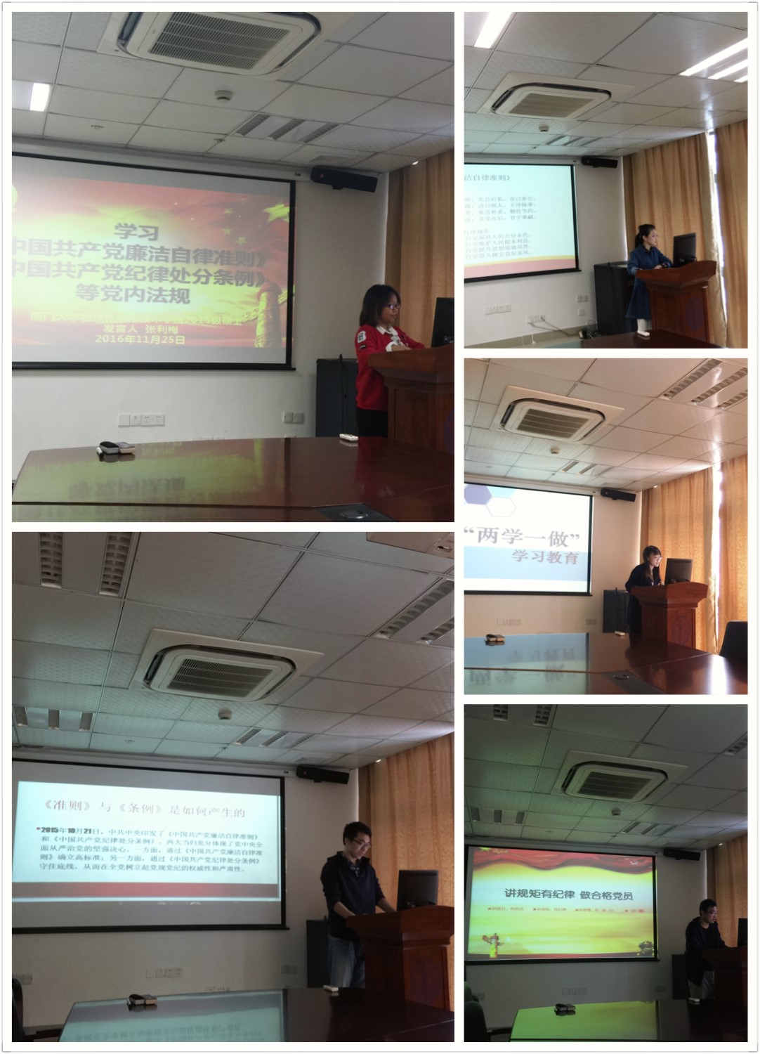 随后,刘畅同志给大家介绍了《准则》和《纪律》是如何产生的。2015年10月21日,中共中央印发的两大党规充分体现了党中央从严治党的坚定决心。一方面,通过《中国共产党廉洁自律准则》确立更高标准,划出高线;另一方面,通过《中国共产党纪律处分条例》提出最低要求,守住底线,从而在全党树立起党规党纪的权威性和严肃性。紧接着,朱丽芸、李雪萍以及毛亦琛同志分别从自己的角度出发,就关于《准则》和《纪律》的内容给在座的党员上了一堂生动的党课。