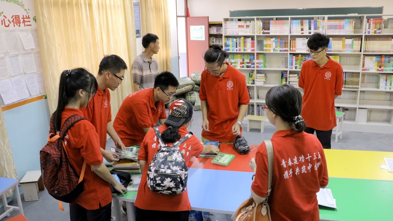 实践队员为中复村小学建立了“厦大图书角”。为了建立这个图书角,实践队早在一个月前就启动了图书捐赠活动,一共募集到五十余本书。队员们肩扛手提,将书籍从厦门带到中复村,捐给了中复村小学,为学生们奉献了自己的一份爱心。