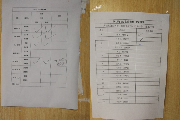 检查组逐一进入各个研究生办公室,对办公室中电器、实验物品摆放使用、值日安排、卫生状态、安全隐患一一进行了检查,做出了详细的记录,并与办公室负责老师和学生沟通。此次检查发现几点建议如下: