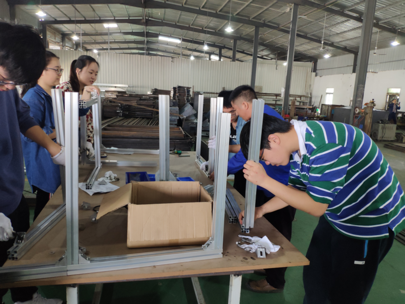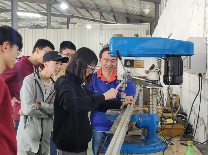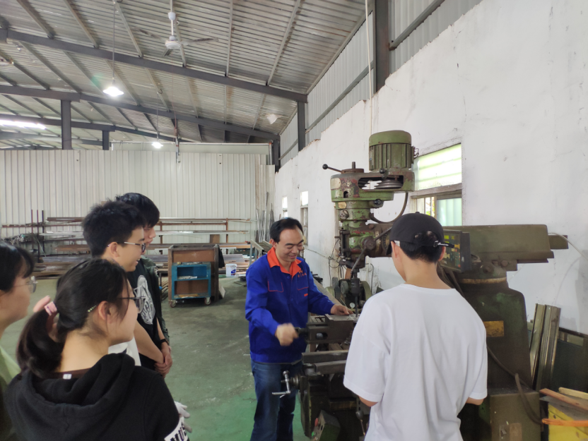 20个成员分成三个小组,在师傅们的讲解下,操作不同的器械:滚筒输送线的组装和应用、铝合金型材的组装和应用;金属切削加工钻床和铣床的应用。