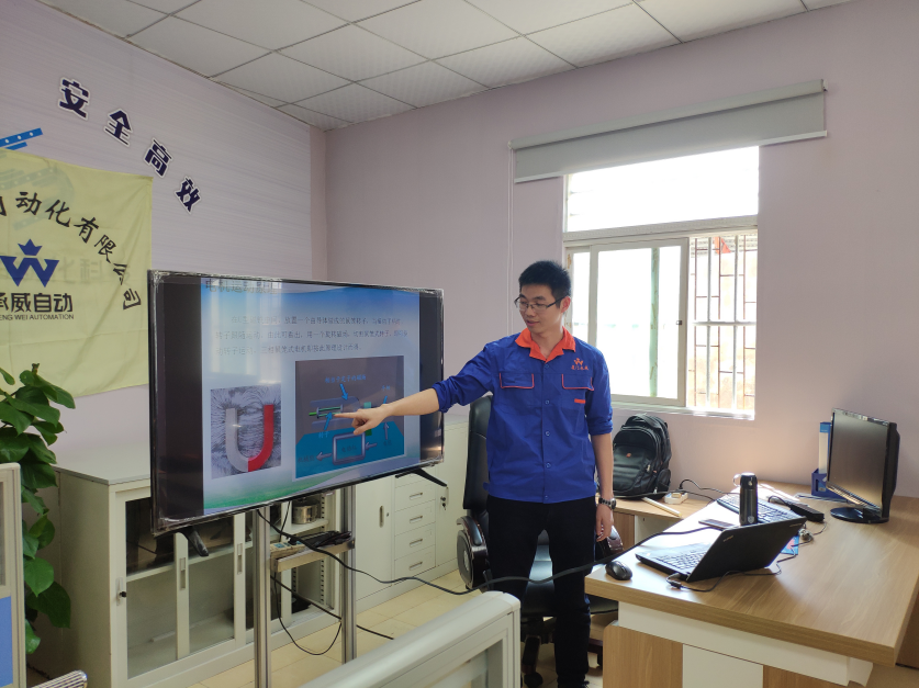 你知道发电机和电动机的原理吗?你知道它们的内部构造吗?动手实践完,同学们回到办公室,听潘才保工程师为大家普及PLC的实践应用知识,现场演示简易自动化电路程序编写及应用。
