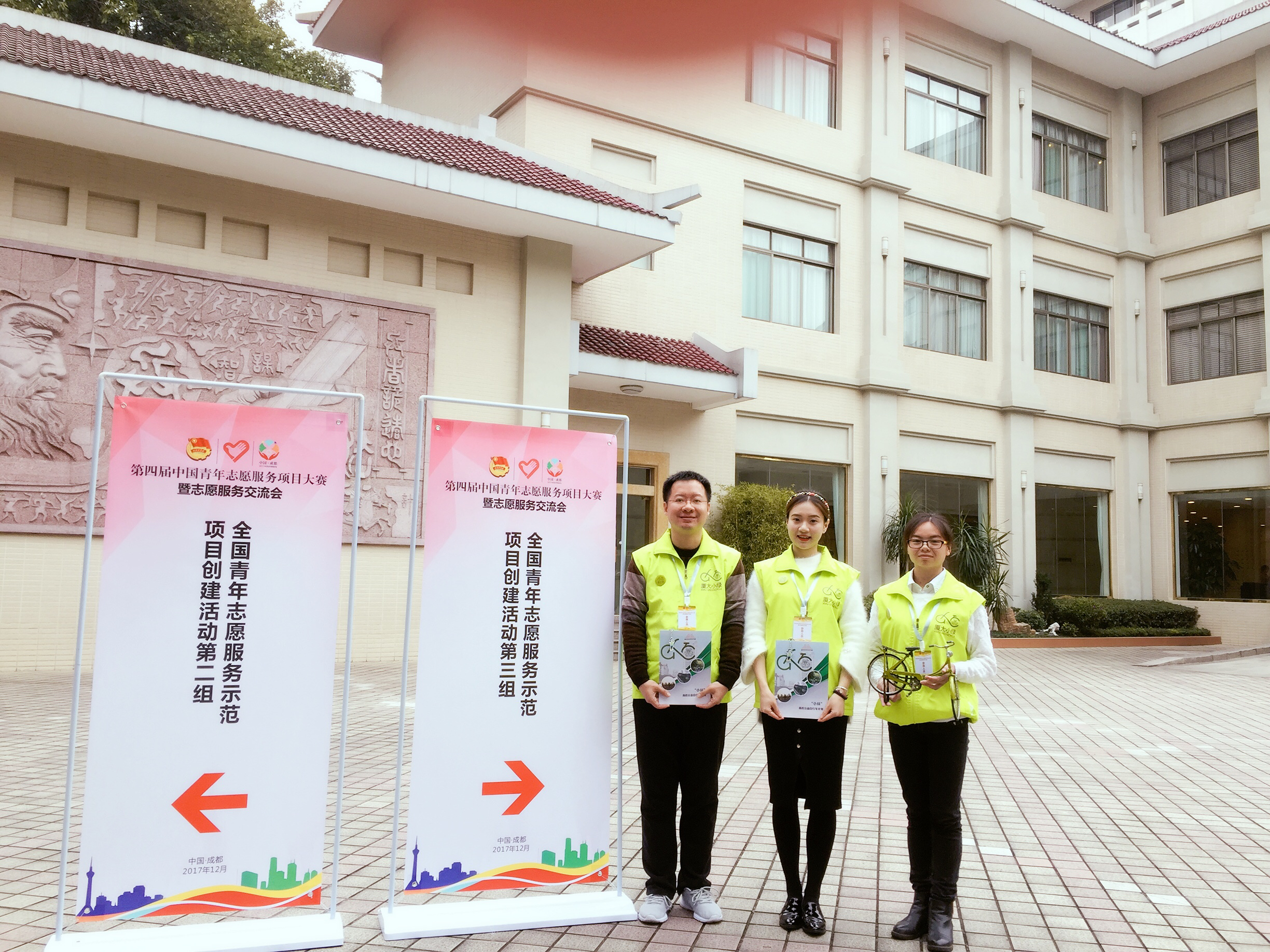 12月3日,由共青团中央、中央文明办、民政部、水利部、国家卫生和计划生育委员会、中国残疾人联合会、中国志愿服务联合会等7个中央有关部门和中共四川省委、四川省人民政府、中共成都市委、成都市人民政府联合举办的第四届中国青年志愿服务项目大赛暨2017年志愿服交流会在四川成都落下帷幕,来自全国38个省级赛会单位、高校、公益机构、基金会、爱心企业代表、项目代表和青年志愿者代表等1300余人参加了本次大会。在示范项目创建评审中,由厦门大学物理科学与技术学院负责的“小绿”高校公益自行车计划志愿服务项目从历年1500个金银奖项目中脱颖而出,成功入选全国青年志愿服务示范奖。