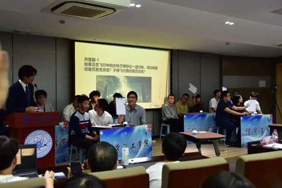 冲出初赛的重围,来自物理科学与技术学院,化学化工学院,航空航天学院,能源学院,生命科学学院和信息学院(排名不分先后)的团队们坐在台上准备展开较量。直播中同步进行场内外人气投票,获得人气最高的则为物理科学与技术学院的团队并获得现场相应加分。