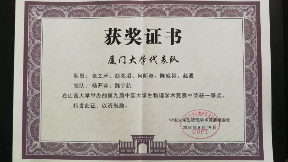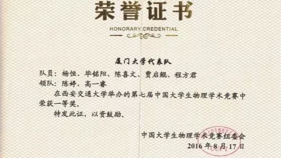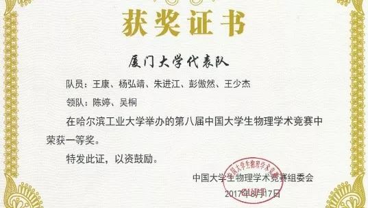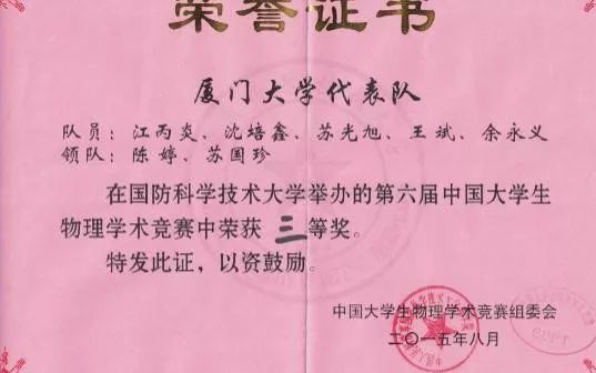 2015年开始,厦门大学也参与到CUPT比赛中。针对比赛特点,学校专门开设创新课程,开展科研训练,成立CUPT创新俱乐部和用实验室,提升各项基础性条件,也助力其他教学科研活动的开展。每年厦门大学均会组织校内物理学术竞赛(XMUPT)初赛和复赛,选拔优秀学生参加地区赛和国赛,也致力于提升学生的科学素养、研究水平。以物理科学与技术学院的学生为主力,学校组建了强大的参赛团队和教师辅导团队。我校越来越多的学生参与其中,学生专业遍布物理、天文、电子、航空、机电、动力工程、应用数学、化学、材料、生物等多类学科。通过比赛准备过程,学生深化了对物理概念和图像的理解,培养了思维能力,提升了表达沟通能力和团队协作能力,也更加清晰地获知物理学科的发展前沿、热门议题。