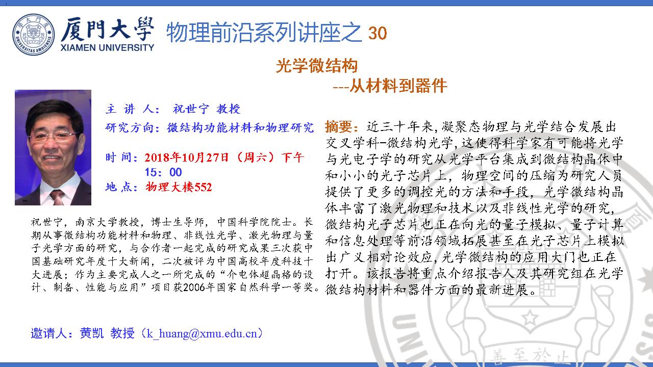 摘要:近三十年来,凝聚态物理与光学结合发展出交叉学科-微结构光学,这使得科学家有可能将光学与光电子学的研究从光学平台集成到微结构晶体中和小小的光子芯片上,物理空间的压缩为研究人员提供了更多的调控光的方法和手段,光学微结构晶体丰富了激光物理和技术以及非线性光学的研究, 微结构光子芯片也正在向光的量子模拟、量子计算和信息处理等前沿领域拓展甚至在光子芯片上模拟出广义相对论效应,光学微结构的应用大门也正在打开。该报告将重点介绍报告人及其研究组在光学微结构材料和器件方面的最新进展。