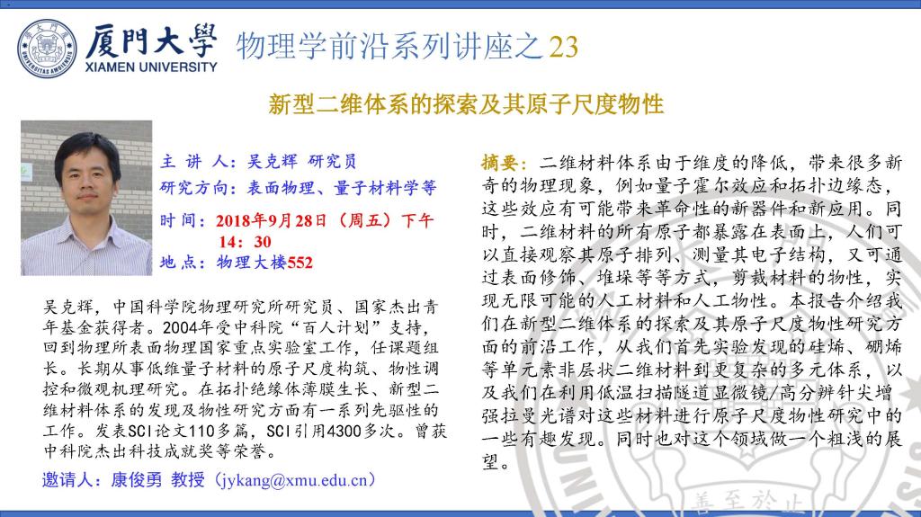 二维材料体系由于维度的降低,带来很多新奇的物理现象,例如量子霍尔效应和拓扑边缘态,这些效应有可能带来革命性的新器件和新应用。同时,二维材料的所有原子都暴露在表面上,人们可以直接观察其原子排列、测量其电子结构,又可通过表面修饰、堆垛等等方式,剪裁材料的物性,实现无限可能的人工材料和人工物性。本报告介绍我们在新型二维体系的探索及其原子尺度物性研究方面的前沿工作,从我们首先实验发现的硅烯、硼烯等单元素非层状二维材料到更复杂的多元体系,以及我们在利用低温扫描隧道显微镜/高分辨针尖增强拉曼光谱对这些材料进行原子尺度物性研究中的一些有趣发现。同时也对这个领域做一个粗浅的展望。