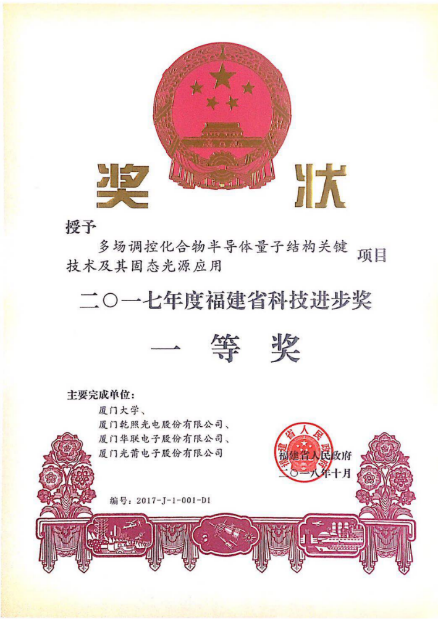 基于多场调控化合物量子结构关键技术及其在固态光源的规模化应用,生产出超高光效GaN基白光LED产品。技术推广应用2015-2017年间实现23.6亿产值,利润近2亿。项目成果获2017年度福建省及厦门市科学技术进步奖一等奖。