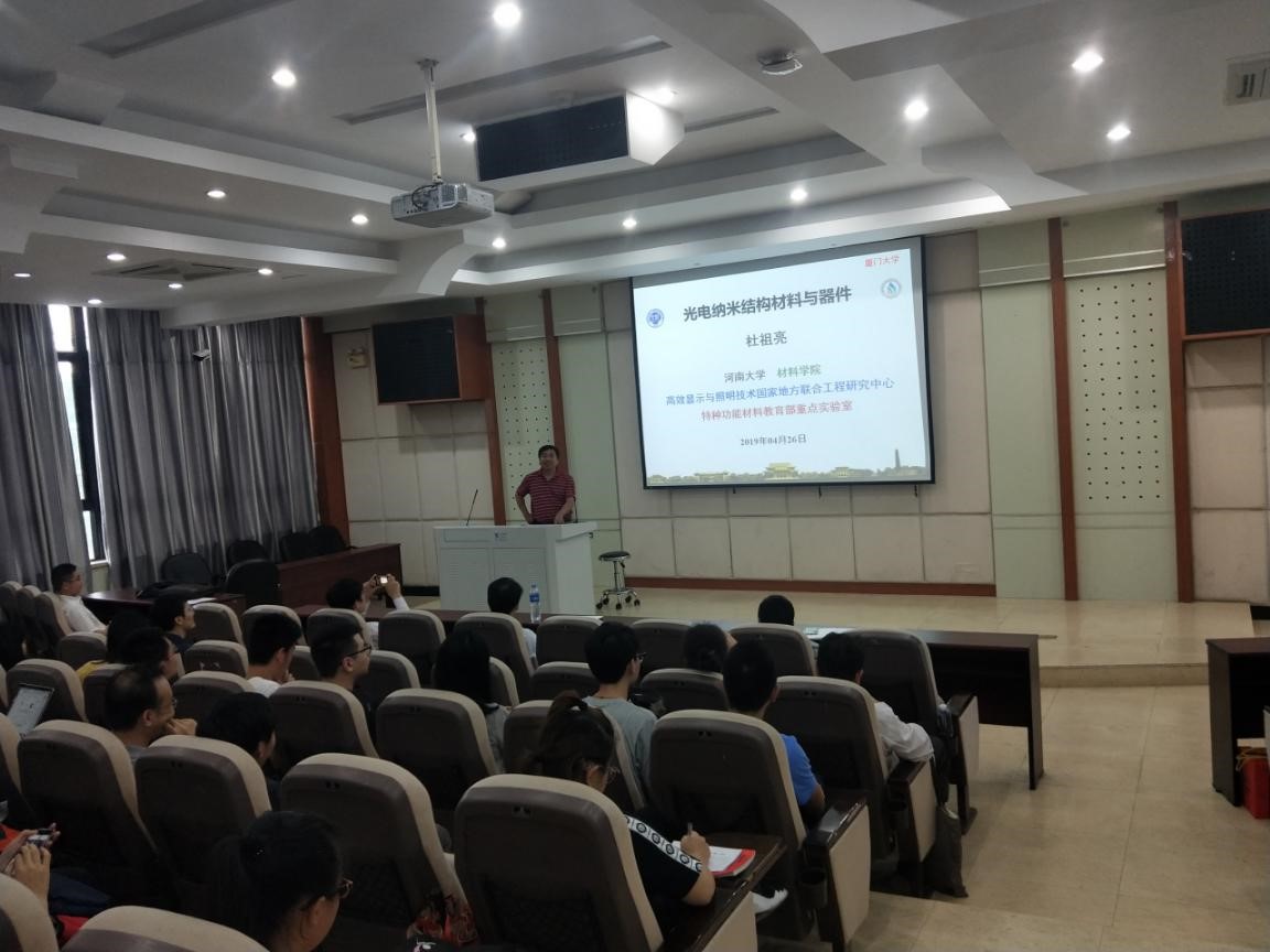4月26日下午,河南大学高效显示与照明技术国家地方联合工程研究中心/特种功能材料教育部重点实验室主任、材料学院院长杜祖亮教授应厦大物理科学与技术学院康俊勇教授的邀请,来我系进行学术交流,并在海韵教学楼504报告厅为广大师生做题为“纳米结构光电材料与器件”的学术报告,副院长李书平教授担任主持人,物理科学与技术学院相关师生参加了此次报告会。