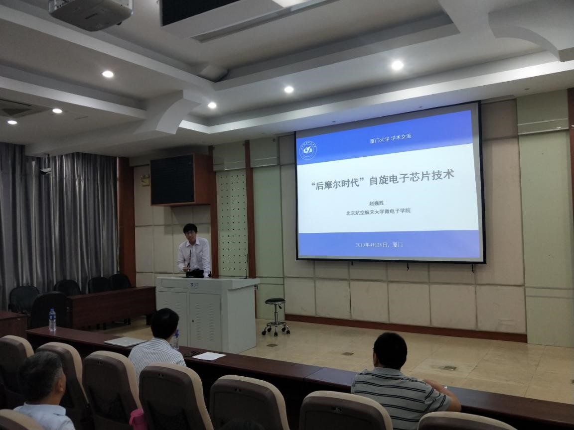 4月26日下午,北京航空航天大学,北航费尔北京研究院院长赵巍胜教授应厦大物理科学与技术学院吴志明教授的邀请,来我系进行学术交流,并在海韵教学楼504报告厅为广大师生做题为“‘后摩尔时代’自旋电子芯片技术”的学术报告,吴志明教授担任主持人,物理科学与技术学院相关师生参加了此次报告会。