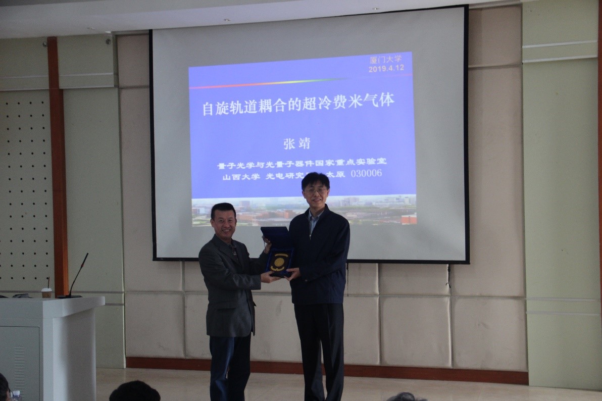 2019年4月12日,国家杰出青年科学基金获得者,山西大学量子光学与光量子器件国家重点实验室主任张靖教授应邀为广大师生带来了题目为“自旋轨道耦合的超冷费米气体”的南强学术讲座。讲座由我院陈理想副院长主持,我院党委书记林奋强为张靖教授颁发了“南强讲座”荣誉纪念牌。
