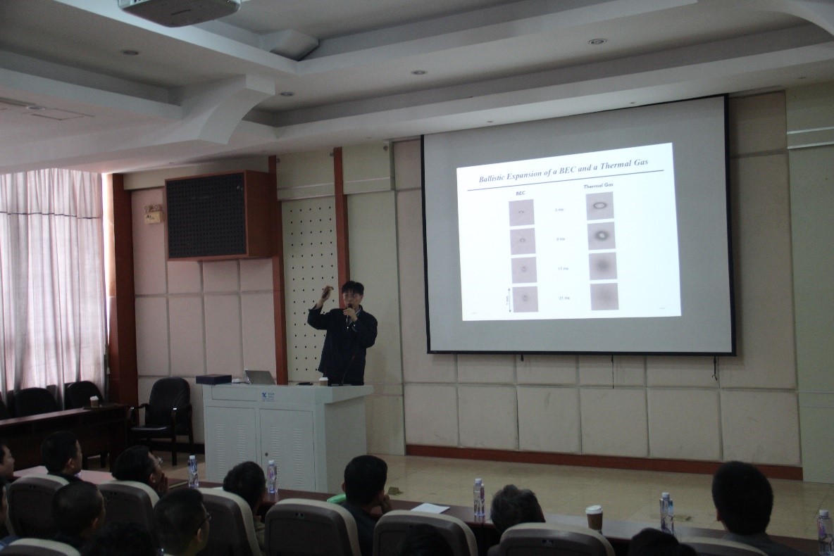 张靖教授在报告中讲到,E. A. Cornell, W. Ketterle和C. E. Wieman于1995年首次在碱金属原子气体中实现玻色爱因斯坦凝聚而获得了2001年度诺贝尔物理奖。超冷原子经过了20年的快速发展,特别是实验上结合Feshbach共振、光晶格、人造规范场等量子操控技术,取得了巨大进展,它成为一个独特的理想实验平台,对量子信息、凝聚态物理乃至核物理等多个研究领域产生影响。人造规范势及其导致的自旋-轨道耦合效应是近年来冷原子物理的一个重点研究方向。凝聚态体系中往往研究在电磁场中运动的电子, 而超冷原子是不带电荷的中性原子,因此中性原子在电磁场中不会直接产生类似电子在电磁场中的效应。但利用绝热近似几何位相等效产生的人造规范场可使超冷原子感受到一个等效电磁场。近几年实验上产生人造规范场获得重要进展,采用光与超冷原子拉曼耦合产生自旋-轨道耦合人造规范场的方案,山西大学实验组在超冷费米气体的自旋轨道人造规范势方面做出系列研究工作。
