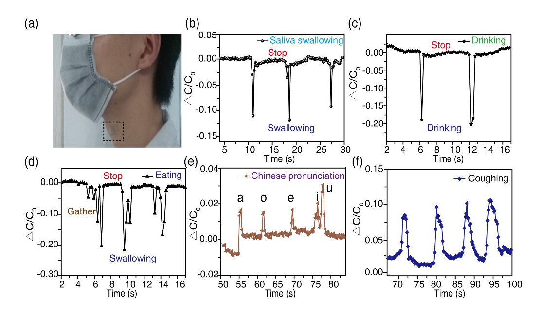 图2 蚕丝基传感器用于检测轻微运动如喉部运动。a)传感器检测实物图。b-f)检测不同的运动如吞咽,喝水,吃饭,发音等