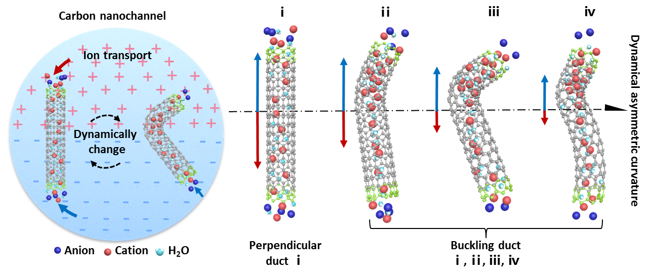 近来,厦门大学物理科学与技术学院侯旭教授(通讯作者)以及特聘副研究员王苗博士(第一作者)首次构筑动态的碳纳米通道,探讨了离子在动态纳米限域空间中的动态传输机制和决定因素,并且发现了其动态变化时的反常离子输运行为。他们发现,在离子尺寸、浓度、价态和外电势的特定协同作用下,弯曲电势和外电势具有相同的数量级,此时,弯曲电势将驱动离子输运。例如,在较小的外电场和较小的离子浓度,并且需要特定的离子,例如钾离子的条件下,纳米通道的轴向非对称变形将会成为引发整流效应的主导因素。而在较大的电场和浓度时,或者锂离子条件下,纳米通道的变形则不会对离子电流产生影响。这个值与我们人体的心肌细胞静息电位以及钾离子浓度值相吻合。他们还发现了纳米通道轴向变形引发的自发离子电流以及对不同价态离子的输运规律。进一步,他们通过纳米通道动态变形,实现了整流与双通道的实时可逆转换。这一发现预测了生命科学的潜在机理,将对纳米尺度的物质输运,细胞生命活动,纳流控的设计等具有重要的意义。