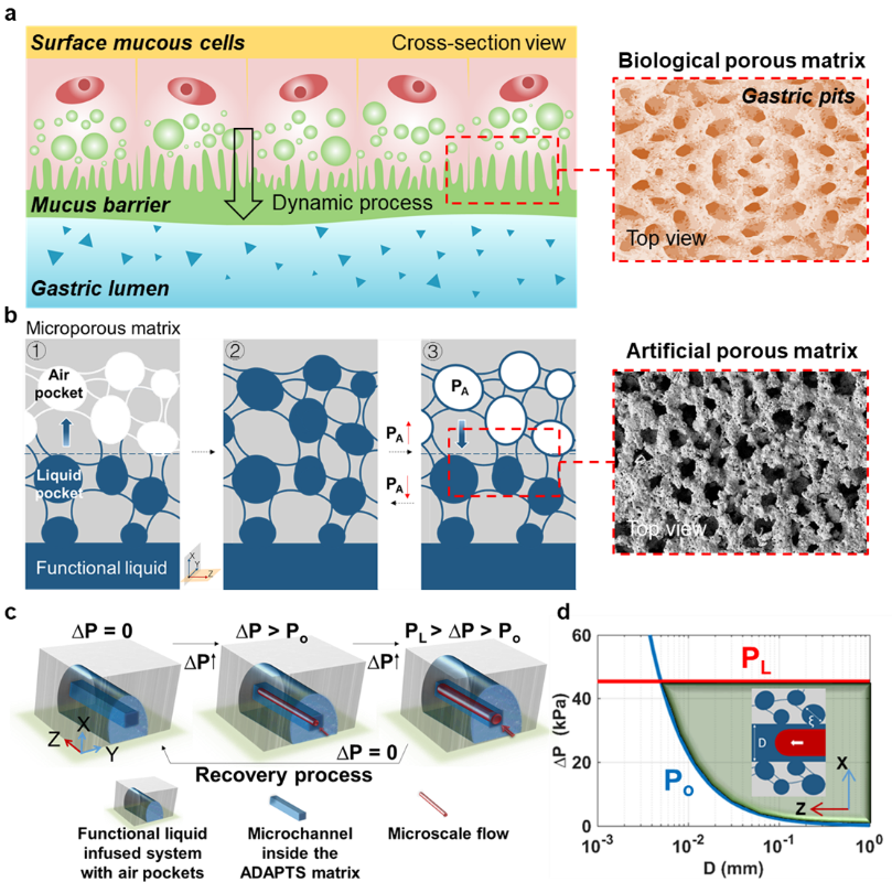 动物胃粘膜的屏蔽效应为研究人员提供了新的灵感,动物胃粘膜屏障中的粘液细胞会分泌粘液保护其免受胃酸的侵蚀。受此启发,研究人员设计合成了具有动态复合液体的多孔高分子膜材料,并在其中构建微米通道,功能液体可以在微孔和微通道中动态流动。突破传统固/液材料界面设计的限制,应用全新的动态固/液/液界面设计制备液体复合高分子膜材料带来优异的抗污染性能,对无机物,有机物以及复合物甚至血液都具有很好的抗污作用。此外,由于微孔与微通道在一个尺度数量级,这样一来,复合功能液体在微孔和微通道中的临界压强阈值就在可以协同调控的范围内,从而获得特有的双门控调控微流体输运行为,为微流体输运控制在药物释放,微反应器,柔性机器人,生物/环境检测技术等发展带来了全新的思路和广阔的应用前景。