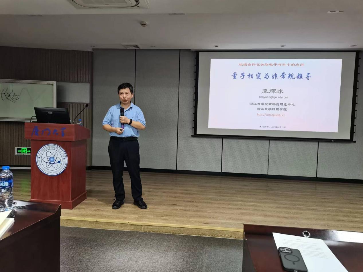 2024年6月21日,浙江大学物理学院求是特聘教授、关联物质研究中心常务副主任袁辉球教授受邀在海韵校区物理楼552报告厅作了主题为“极端条件在关联电子材料中的应用:非常规超导与量子相变”的“萨本栋讲坛”系列讲座第172讲。本次讲坛由厦门大学物理科学与技术学院院长陈张海教授主持。