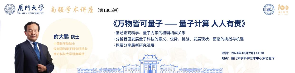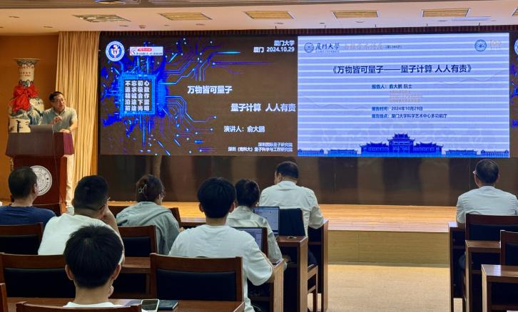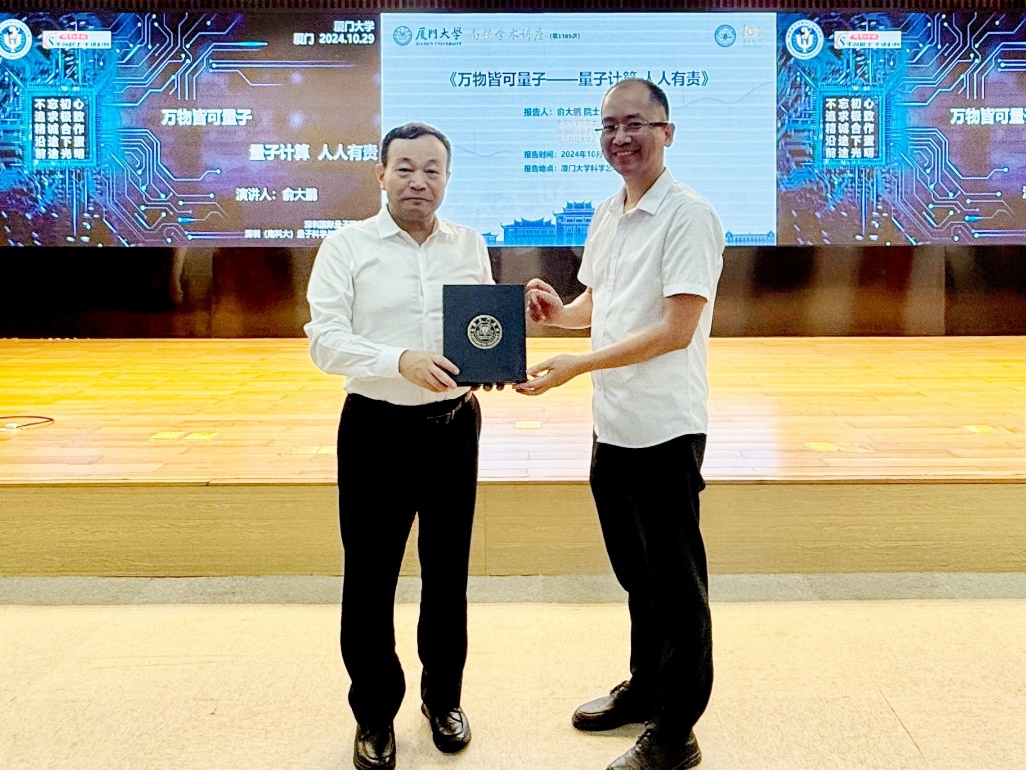 10月29日下午,厦门大学物理科学与技术学院邀请中国科学院院士、深圳国际量子研究院院长、南方科技大学讲席教授俞大鹏,以“万物皆可量子——量子计算 人人有责”为题,在科学艺术中心多功能厅为师生作了一场精彩的南强学术讲座。厦门大学党委常委、副校长尤延铖教授莅临现场为俞大鹏院士授牌,开幕式由物理科学与技术学院院长陈张海主持,全校师生120余人参加讲座。
