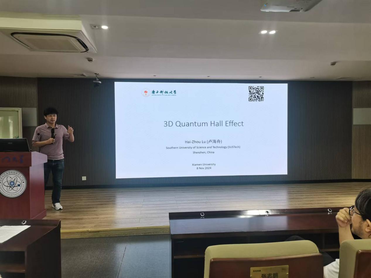 2024年11月8日,南方科技大学物理系卢海舟教授受邀在海韵校区物理楼552报告厅作了主题为“三维量子霍尔效应”的萨本栋系列讲坛第182讲。本次讲坛由厦门大学物理科学与技术学院院长陈张海教授主持。