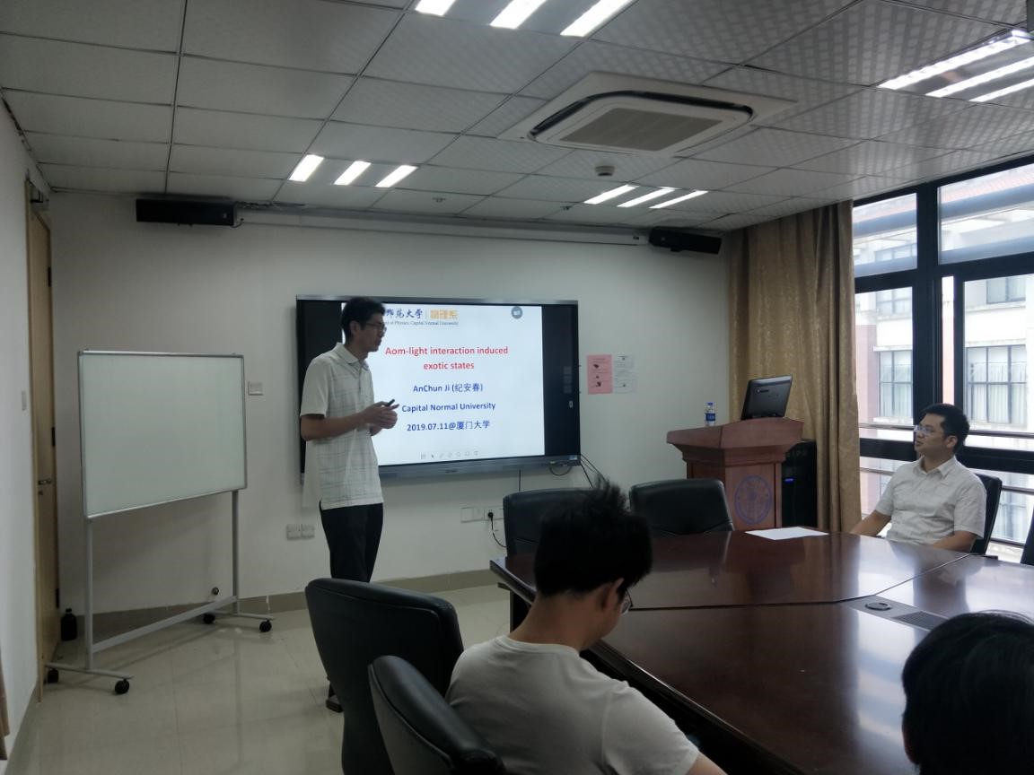 2019年7月11日下午, 首都师范大学纪安春教授受物理科学与技术学院陈理想教授的邀请来我系参观访问,并做了题为“Atom-light interaction induced exotic states”的学术报告, 陈理想教授担任主持人,物理科学与技术学院相关师生参加了此次报告会。