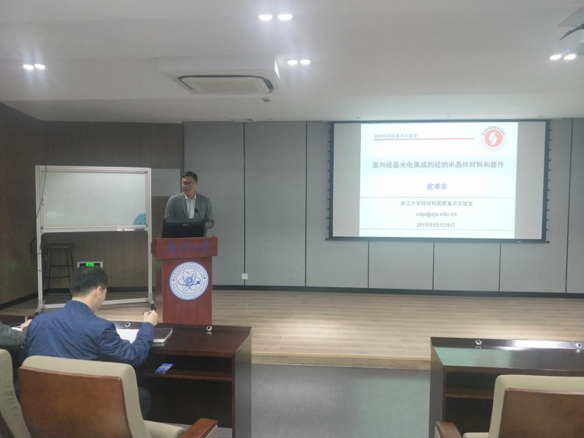 3月29日下午,浙江大学皮孝东教授应厦大物理科学与技术学院李成教授的邀请,来我系进行学术交流,并在物理大楼552会议室为广大师生做题为“面向硅基光电集成的硅纳米晶体材料和器件”的学术报告,吴志明教授担任主持人,物理科学与技术学院相关师生参加了此次报告会。