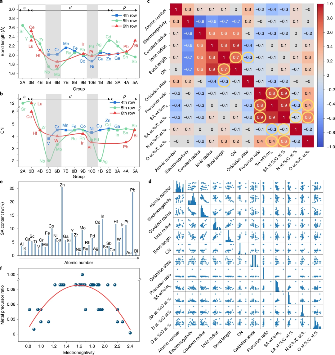 要点1:如图2a,b所示,键长最初减小,然后增加,随后在图1b中的每一行中从左到右振荡。要点2:根据图2c、d中SAC特性的相关分析,发现键长与氧化状态呈负相关,与配位数呈正相关。这一发现表明了一个普遍原理,即较大的氧化状态和较小的CN会导致较小的键长,反之亦然。要点3:负载量与最大金属前体比率呈最正相关,表明可以通过调整比率来控制负载量,即也是一个普遍的原则。要点4:绘制了最大SAC金属前体比率与电负性的曲线,发现随着电负性的增加,比率最初增加,然后变平,最后降低,这表明存在抛物线关系。相比之下,电负性与负载量(SA wt%/ma)之间的抛物线关系不如电负性与金属前驱体比率之间的抛物线关系明显。合成SACs的金属前驱体比例的上限可以通过相应的金属电负性来定量预测,这是一个重要的一般原理。要点5:负载量与SAC中的O含量呈很大的正相关,与SAC中的N含量呈小的负相关,这是另一个一般原则。这一令人惊讶的发现表明,氧含量可能在控制SA负载方面发挥比氮含量更重要的作用。
