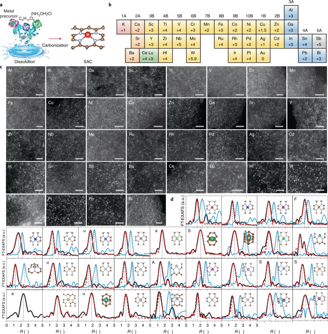 要点1: 使用溶解碳化法合成了一个负载在碳上的37种不同金属元素的单金属SACs大型库。要点2:通过像差校正高角度环形暗场扫描透射电子显微镜(HAADF-STEM)、同步辐射软X射线吸收光谱(XAS)和X射线吸收精细结构(XAFS)光谱以及多种表征手段证实了这些SACs的结构。