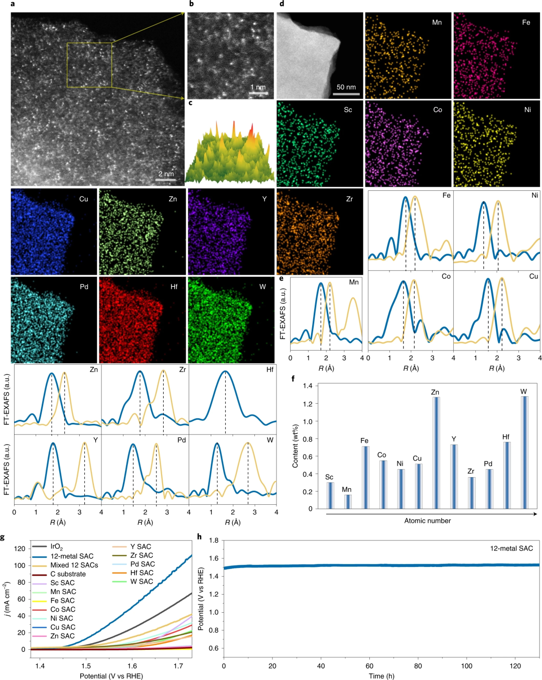 要点1:通过控制多种金属前体的种类和浓度,成功合成了含有V、Cr、Mn、Fe、Co、Ni、Cu和Zn的八种金属SAC,以及含有Sc、Mn、Fe、Co、Ni、Cu、Zn、Y、Zr、Pd、Hf和W的12种金属SAC。原子分辨率STEM图像显示,SAs均以原子方式均匀分散在碳载体上。12个金属SAC的总金属负荷达到7.53 wt%,这被认为是一个高值。这些结果表明,使用SA锚定位点作为结构单元组装浓缩复合多金属SAC材料没有根本限制。要点2:为了探索它们的电催化作用,对12金属SAC、相应的机械混合12单金属SAC和相应的单个单金属SAC进行了电催化析氧反应 (OER) 实验。样品的代表性OER电流在0.1 M KOH水性电解质中以10 mV s-1的扫描速率测量。12金属SAC的电流密度、质量活性和TOF高于相同电位下混合和单独的单金属SAC,表明12金属SAC对OER的活性更高。这些结果表明12金属SAC中的多元素协同作用可以进一步增强OER活性。要点3:在12金属 SAC上以10 mA cm-2的恒定电流连续运行OER 130 h,在此时间间隔内未观察到电位明显增加,这表明12金属SAC对OER具有高稳定性,可归因于金属和载体之间的强键合导致的稳定结构。