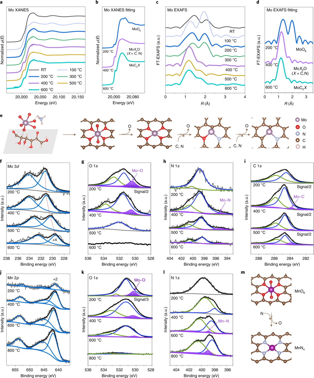 要点1:对于原位研究,选择Mo SAC的合成作为高电负性金属的示例。随着温度的升高,钼酸铵首先转变为基于一个Mo原子与六个O原子配位的局部结构,然后较长的Mo–O键将首先断裂。随后,其他四个Mo–O键上的O原子依次被N或C取代,形成MoX2O(X = N或C)。最后,形成了Mo价态为+4的MoC2X结构;要点2:以Mn SAC的合成为例,说明具有中等电负性的金属。Mn原子首先与六个O原子形成配位,与Mo SAC合成不同,Mn-O键在600°C时仍存在于样品中。此外,当温度升至800°C时,Mn-O键消失,Mn-N键保留,XANES和EXAFS光谱与MnN4结构的光谱非常匹配。