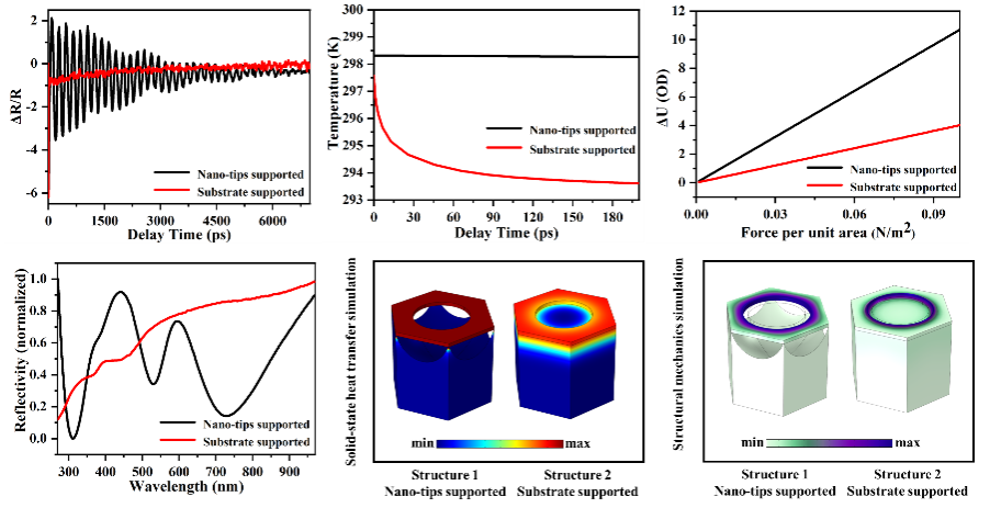 纳米光机系统指通过光诱导电磁力、热应力、辐射压力或梯度力来驱动纳米结构运动或机械振荡的能量转化系统,由于其精确可控的光学共振和机械振荡响应特性而在全光机械操纵、光信号处理、超灵敏机械传感以及声子的量子操纵等方面具有巨大的应用潜力。然而,传统的光机械系统由于较高的能量损耗问题而严重限制了纳米光机械系统的进一步发展。在该工作中,杨志林教授团队通过导向自组装和电感耦合等离子体刻蚀工艺,成功设计并制备了一种针尖支撑的超高均一度半悬浮态纳米光机械超表面,该超表面达可达到平方厘米量级。小于5纳米的针尖支撑的半悬浮超表面有效地提高了光机系统对脉冲激光的近场能量耦合效率,同时最大程度的减小了结构的机械能和热能损耗,最终在超快全光光机操控中大幅度提高了光机转换效率,并将有效振荡时间提高了近两个数量级。这种多通道能量减损的纳米光机系统的设计思路可以被推广到目前绝大多数片上加工的光机械系统的性能提升上。同时,这种半悬浮态光机超表面的结构设计策略将推动稳态超材料向超快可重构的方向发展,并将进一步推动光机系统的高度集成化。
