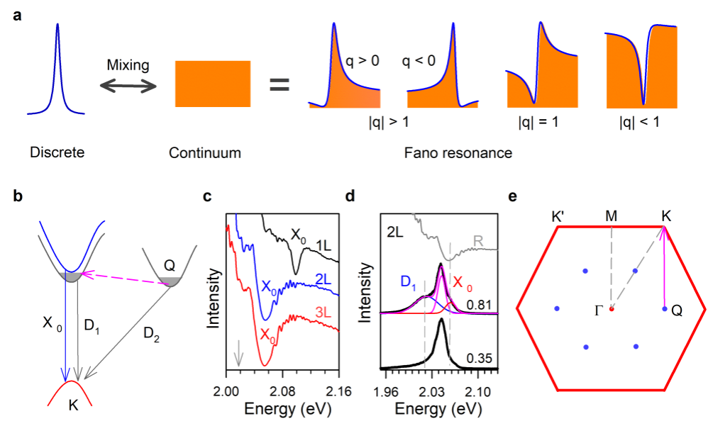 图1,Fano共振示意图,暗激子跃迁示意图,亮激子暗激子的实验观测以及布里渊区QK与ΓM波矢匹配示意图。