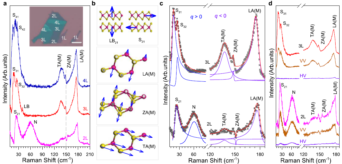 为了研究动量禁戒的暗激子与声子的作用,李运美课题组与中科院半导体所谭平恒和张俊课题组合作,首先通过数值孔径下的光致发光(PL)谱确认了少层WS2亮态A激子与自旋禁戒暗态A激子的存在(见图1c,d)。对于多层WS2导带底从K谷变为Q谷。如前面理论预言,Q-K之间跃迁的动量正好可由布里渊边界M点声子的波矢来补偿(见图1b, e)。因此边界M点的一阶声子就有可能通过拉曼光谱直接进行测量,在这个过程中预期能观察由导带Q谷的电子和价带K谷空穴形成的暗激子。