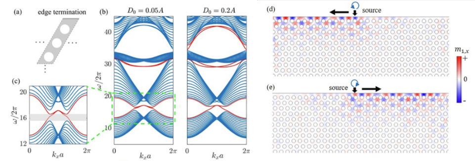 按照体边对应关系,对于任何一个带隙,之下所有能带的自旋陈数之和非零时,带隙中间会出现螺旋的边缘态。条带的构造以及能谱如图3所示,验证了边缘态的出现,手性相反地两支在同一边界上沿着相反方向传播,微磁学模拟可以验证这一点,这样在边界上存在一个方向传输的自旋流,平行的边界上自旋流方向相反。是否存在在平行界面上同向的边界自旋流呢?答案是存在的。我们通过实现反螺旋的边缘态来实现。