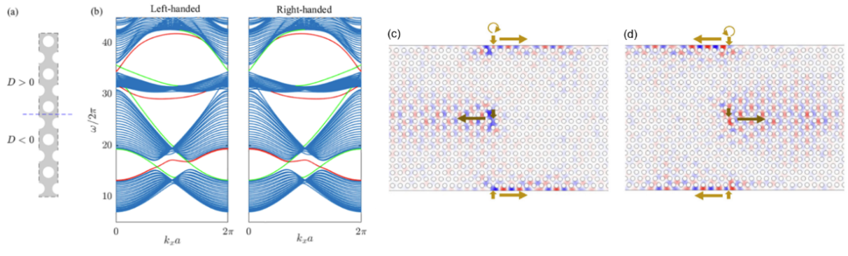 图4. (a). 实现反螺旋边界态的方案示意图。(b). 左手性和右手性支能谱。(c). (d). 微磁学模拟结果。