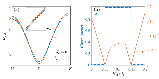 图9. (a) 零温时自旋波能带。(b) 声学支陈数以及带隙随着A子格上易轴各向异性强度的变化。