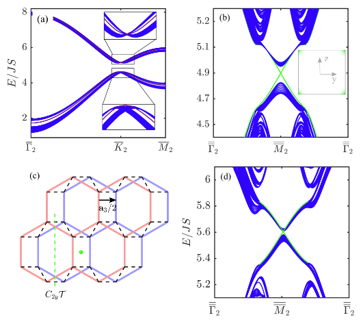 另外在z方向存在σhT对称性,因此沿着kz存在量子化的极化,为0或者12。由于单层是由自旋波拓扑为陈绝缘体相,因此整个体系存在Z2×Z的拓扑相。当z方向极化为12时,上下表面存在陈的表面态,因此支持沿着水平棱的手性棱态,如图7(a) (b)所示。这些受磁对称性保护的二阶拓扑在不同的堆垛和其他相互作用如XYZ各向异性和Kitaev相互作用下都一直存在,如图7(c) (d)所示。