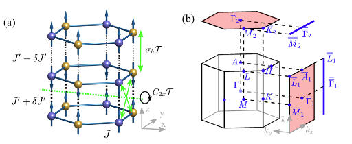 图5. (a). 堆垛的六角铁磁结构。对应保护二阶拓扑的磁对称操作如图所标记。(b). 布里渊区及到低维的投影。